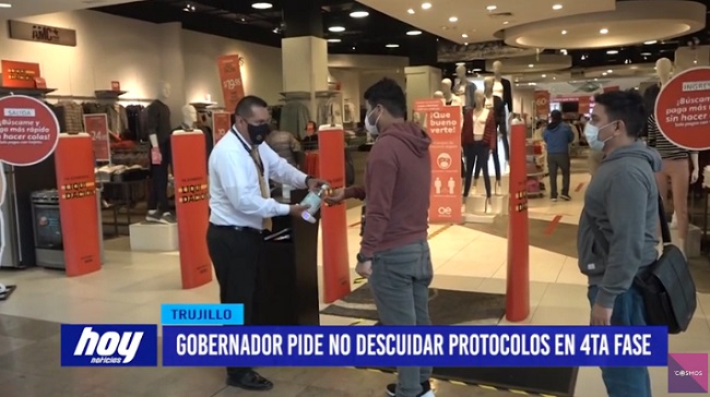 Se inicia fase 4 de la reactivación económica. Y con ello los restaurantes y servicios afines ahora podrán funcionar con un aforo de 50% de sus instalaciones. Además, las tiendas comerciales y conglomerados ahora podrán contar con un aforo de 60%. Sin embargo, el gobernador regional Manuel Llempén pide a la población continuar con los protocolos sanitarios. Añade que la apertura de gimnasios es necesario para la salud, en estos momentos de pandemia.