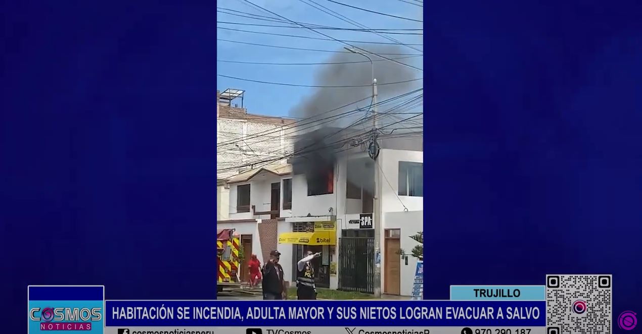 Dos ambientes del segundo piso de una vivienda ardieron en llamas la mañana del miércoles en Trujillo. Este siniestro ocurrió en la calle Santo Toribio de Mogrovejo, cuadra tres, Urb. San Andrés. Vecinos agregaron que vieron salir humo por la ventana de este inmueble, por lo que ayudaron a una adulta mayor, sus dos nietos y una mascota a evacuar la vivienda afectada.