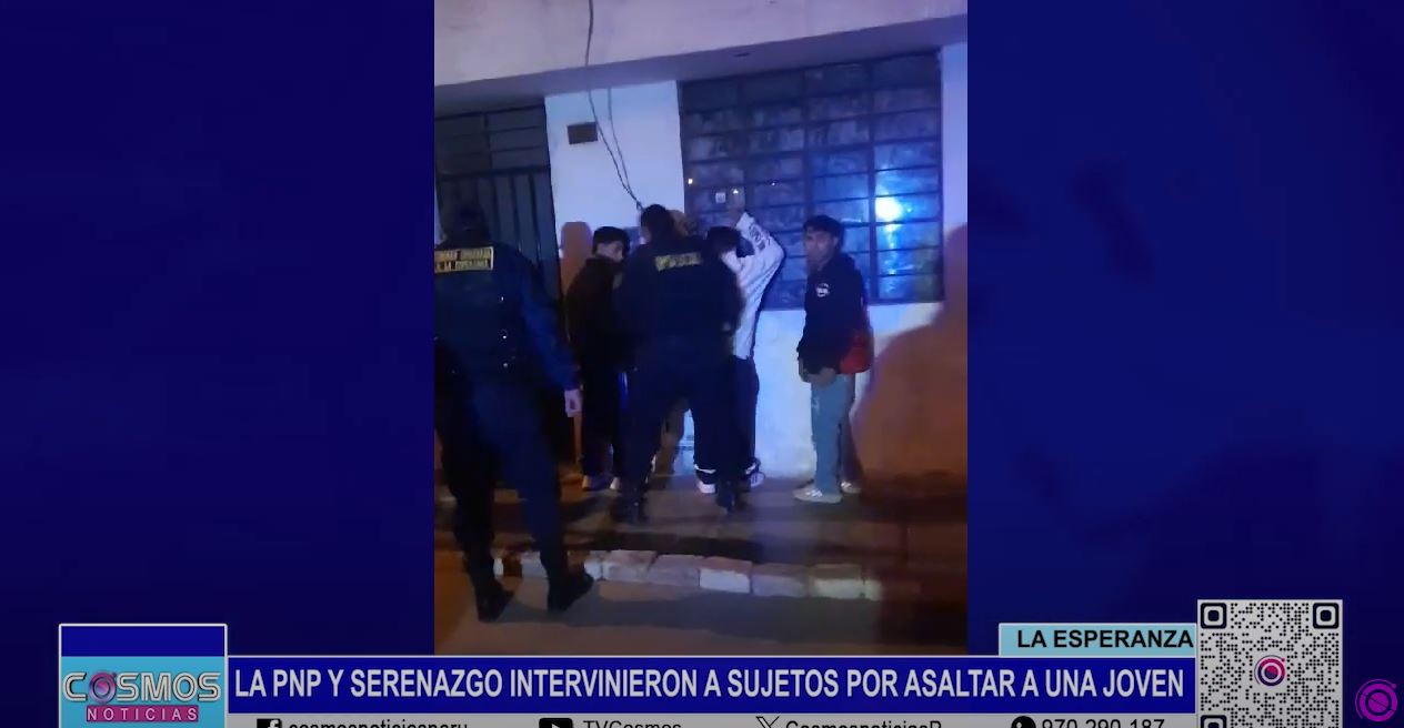 La PNP y serenos, tras el patrullaje integrado, lograron intervenir a cuatro sujetos en el sector Manuel Arévalo, en el distrito de La Esperanza, quienes habrían asaltado minutos antes a una joven.