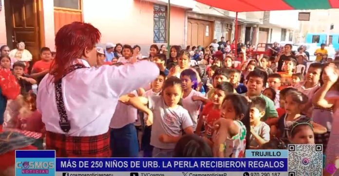 Un grupo de amigos llevó alegría, regalos y una chocolatada a más de 250 niños de la Urbanización La Perla en Trujillo. TV Cosmos, también se hizo presente con algunos regalos.