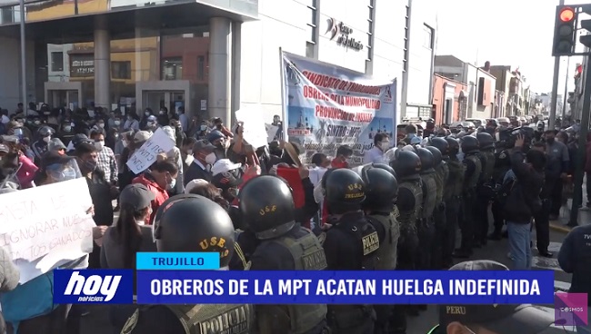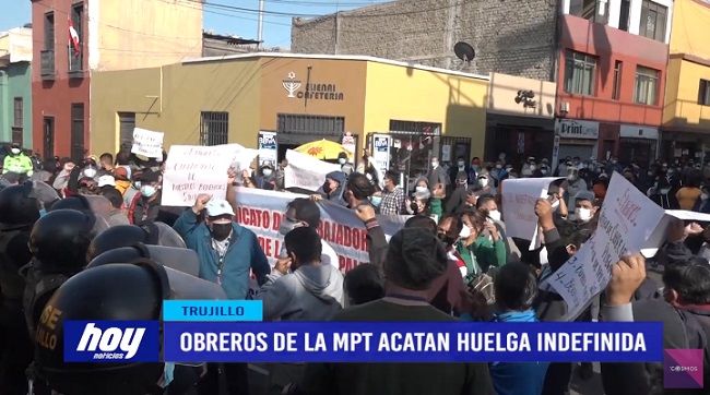 Sindicato de trabajadores obreros de la municipalidad provincial de Trujillo dieron inicio al primer día de huelga indefinida. Ellos piden que se les haga entrega de vales de alimentos y uniformes pendiente de años anteriores.