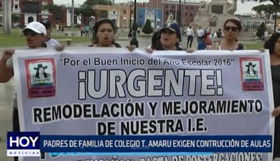 Padres de familia del colegio Túpac Amaru, de Florencia de Mora, exigen al alcalde Elidio Espinoza que inicie la construcción del mencionado centro educativo.