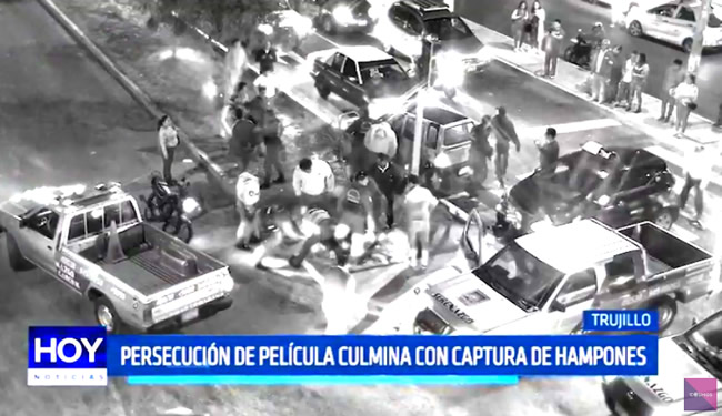 En imágenes la víctima es invitada por los serenos, subir a la unidad, para ir tras los hampones. Desde la avenida Dos de Mayo, se inicia la persecución. Los maleantes a bordo de un taxi tico, emprenden la fuga por la calles Sánchez Carrión de Vista Alegre, luego salen a toda prisa por la calle Bolívar en dirección a la avenida Larco. En la intersección de las vías impactan contra un taxi, dos segundos antes, un motociclista salvó de milagro de ser embestido.