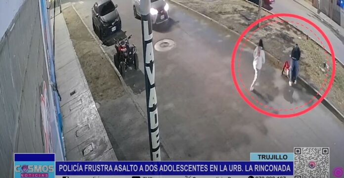 Un delincuente armado intentó asaltar a dos adolescentes, pero afortunadamente un efectivo policial apareció en su motocicleta e impidió el asalto en la Av. Pesqueda, ubicada en la Urb. La Rinconada, en Trujillo.