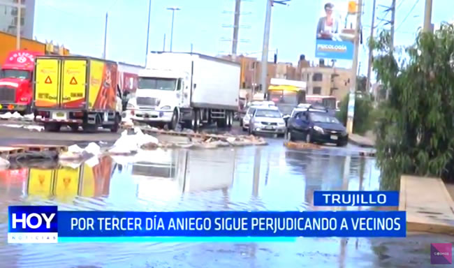 Desde hace tres días, un aniego de aguas servidas perjudica a los vecinos, vendedores y un centro comercial en la cuadra veinte de la avenida Mansiche, la situación se torna fuera de control.
