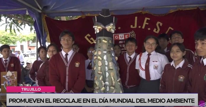 Con la reutilización de distintos objetos, escolares participaron de la feria ambiental realizada en la Plaza Mayor de Trujillo. Alumnas del Colegio María Negrón Ugarte, exhibieron productos de segundo uso como aporte a la conservación del planeta.