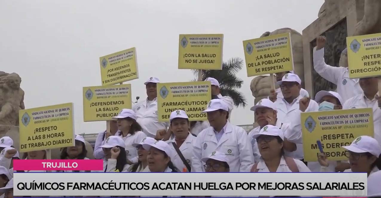 Químicos farmacéuticos de la empresa boticas IP Inkafarma acatan una huelga nacional para exigir el incremento de sus remuneraciones, así como el respeto de sus derechos laborales.