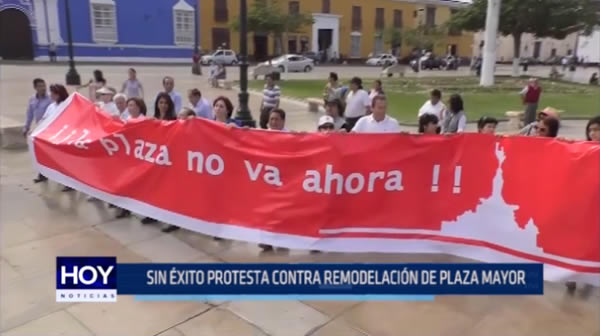 Convocados por el patronato Trujillo Ahora, un reducido grupo de personas llegaron a la Plaza Mayor para protestar por la remodelación de la misma.