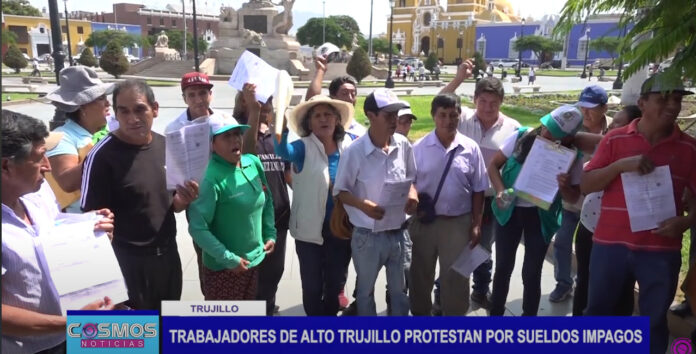Los trabajadores municipales del distrito de Alto Trujillo realizaron un plantón en el frontis de la comuna provincial para exigir que el alcalde cumpla con el pago de sus sueldos. A más de 20 empleados les adeudan su sueldo desde diciembre del año pasado.