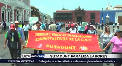 Agremiados al sindicato único de trabajadores administrativos de la Universidad Nacional de Trujillo realizaron una paralización en sus labores a fin de reclamar que se oficialice la reglamentación de la negociación colectiva de todos los entes estatales.