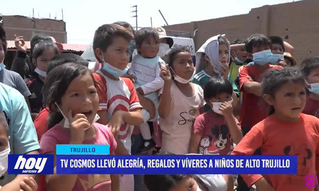 Personal de TV Cosmos como parte de su responsabilidad social, llevo alegría, regalos, víveres y chocolatada a niños de Alto Trujillo barrio 3C. Los menores volvieron a sonreír en medio de tantas dificultades que pasan sus familias.