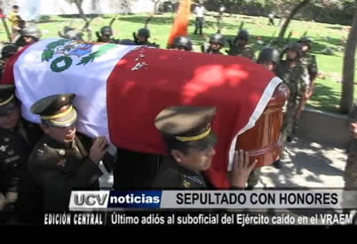 Los restos del suboficial del Ejército Peruano que falleció en el VRAEM el último domingo, fueron sepultados con honores en el cementerio Jardines de la Paz. El soldado trujillano perdió la vida al caer accidentalmente a una cocha profunda en Satipo.