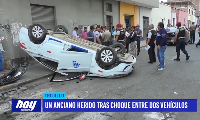Una persona resultó herida, un taxi quedó volteado y otro auto particular también se vio perjudicado en un accidente ocurrido en la intersección de los jirones Bolívar y Estete.
