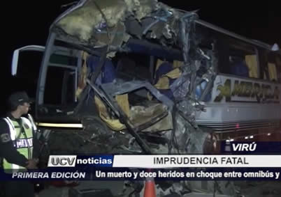 Un muerto es el saldo de un accidente de tránsito entre un ómnibus de la empresa América Express que venía de Chimbote a Trujillo contra un camión cargado con caña. El hecho ocurrió en la Panamericana Norte en Virú.