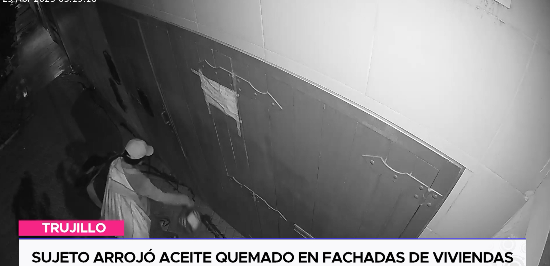 Un sujeto con apariencia de reciclador arrojó aceite quemado en las fachadas de varias viviendas de la urbanización La Merced, durante la madrugada, mientras los vecinos dormían. El hecho fue registrado por cámaras de seguridad.