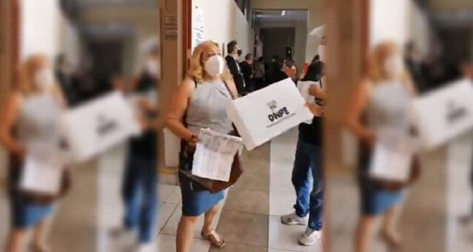 En las imágenes se observa que la mujer menciona que se encontraba recorriendo el local y veía que los miembros de la ONPE ingresaban y salían de las aulas, pero que se acercaban sospechosamente a las urnas.
