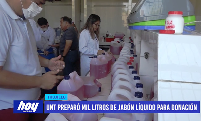Estudiantes, docentes y administrativos de la facultad de Ingeniería Química de la Universidad Nacional de Trujillo, pusieron sus conocimientos a favor de la ciudad de Trujillo en este estado de emergencia y prepararon mil litros de jabón liquido que se repartirán a diferentes instituciones.