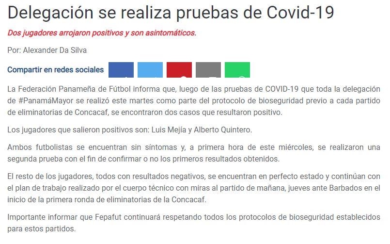 «La Federación Panameña de Fútbol informa que, luego de las pruebas de COVID-19 que toda la delegación de #PanamáMayor se realizó este martes como parte del protocolo de bioseguridad previo a cada partido de eliminatorias de Concacaf, se encontraron dos casos que resultaron positivo. Los jugadores que salieron positivos son: Luis Mejía y Alberto Quintero», se lee en el comunicado de la Federación Panameña de Fútbol.