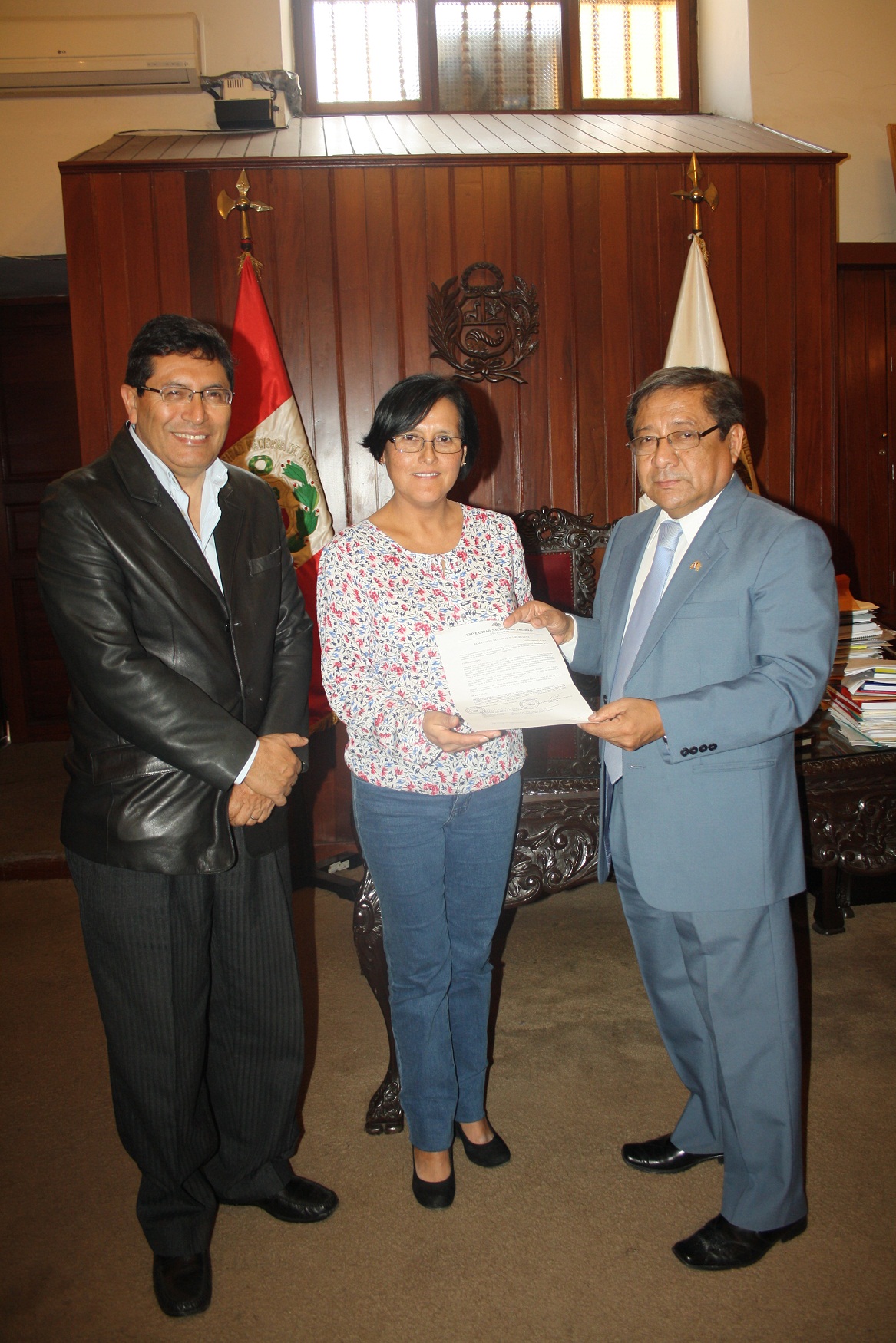 La mañana de ayer el Rector Orlando Velásquez hizo entrega de la Resolución Rectoral 1581-2014/UNT que designa a la nueva representante de la UNT ante el Consorcio Raymondi, integrado por Cedepas Norte, UNT y ONG Asociación de Desarrollo Social Lestonnac.