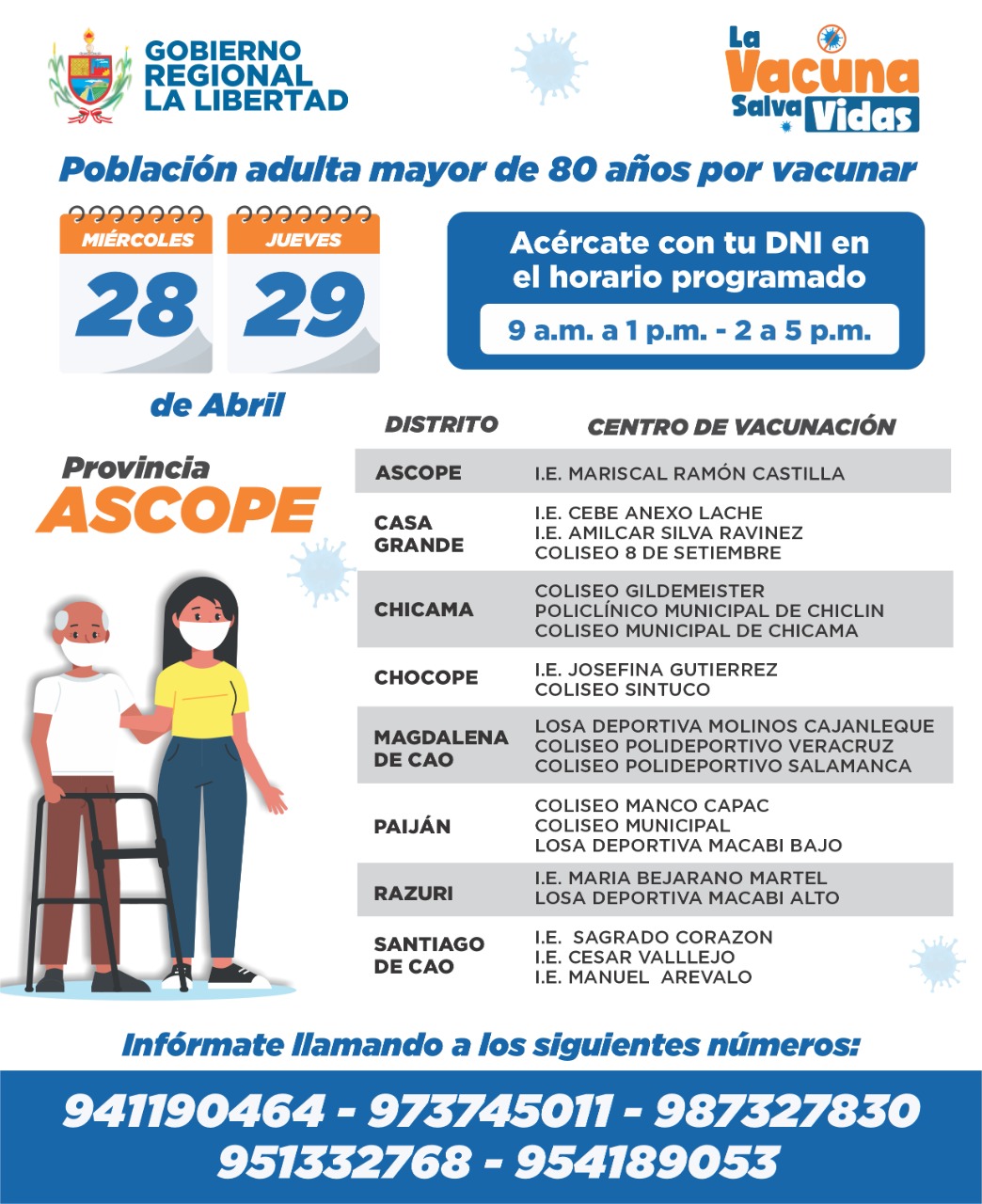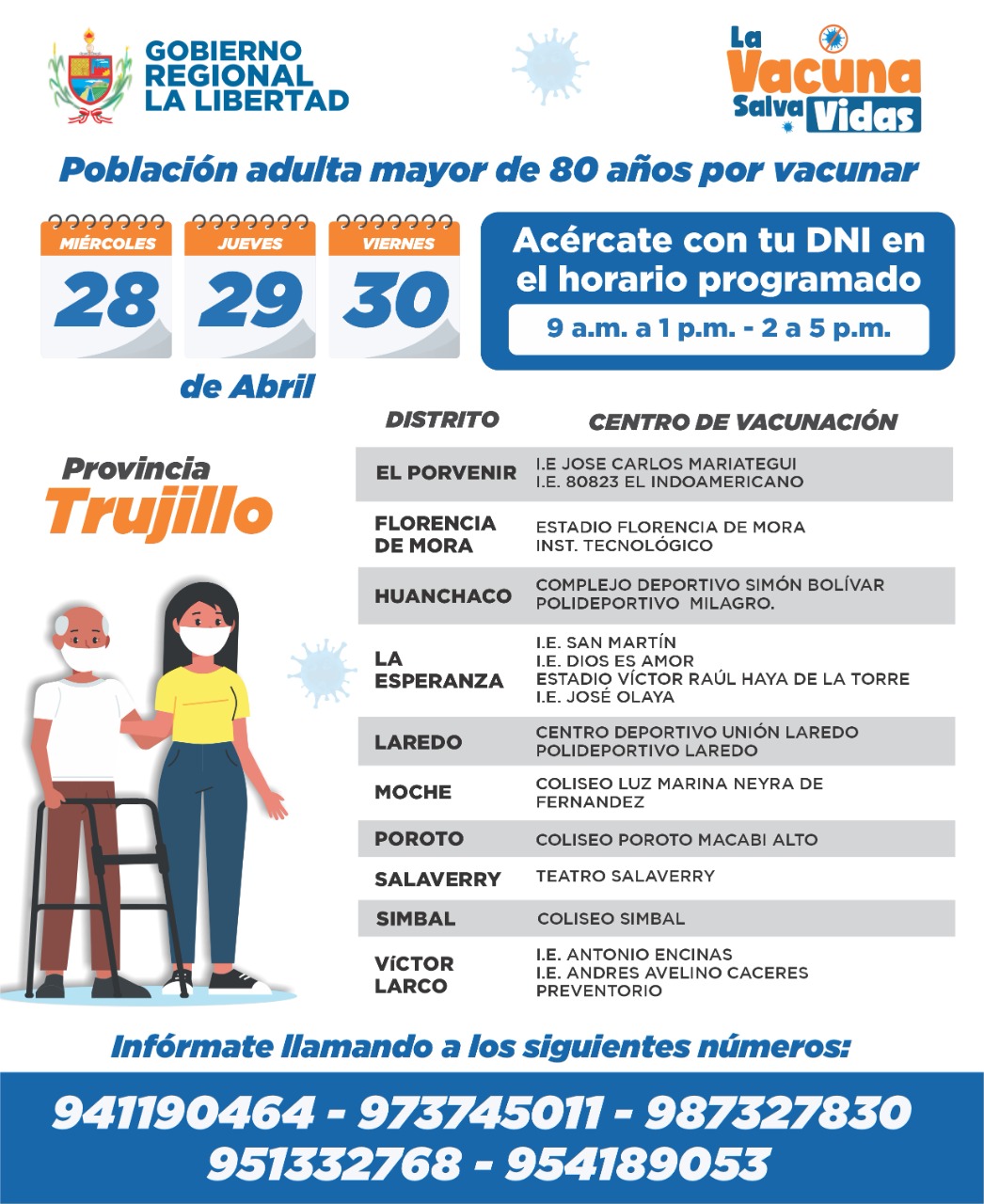 Solo tienes que llevar a tu familiar adulto mayor, al local de vacunación que le corresponda según su distrito. Indispensable que ambos tengan su DNI. Adjuntamos cuadros con los locales, las fechas y las horas en que pueden ir. Evitemos las colas innecesarias y aglomeraciones.