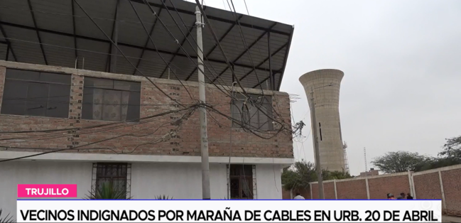 Esta maraña de cables resulta un peligro para transeúntes y conductores y es que ya se ha suscitado algunos incidentes en esta zona ubicada a unas cuadras del centro histórico de Trujillo.