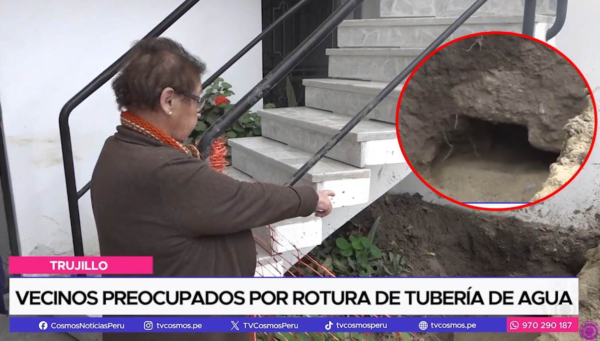 Rotura de tubería causa graves daños. Vecinos de la urbanización Monserrate, en Trujillo, solicitan apoyo a Sedalib para reparar una avería en una tubería de agua en exteriores de una vivienda. Además, preocupa el estado de la base del inmueble contiguo debido a la humedad ocasionada.