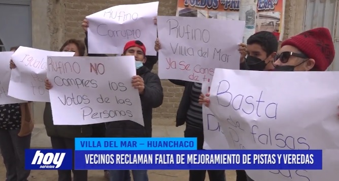 Vecinos del Centro Poblado Villa del Mar protestaron en contra de alcalde de esta comuna, aseguran no haber sido apoyados durante estos 4 años de gestión y ahora que quiere ser reelegido solo estaría haciendo trabajos de veredas para moradores que le darán su voto.