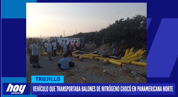 Trágico accidente sucedió en el kilómetro 555 de la Panamericana Norte en Moche, en donde se registró un choque de una unidad de transporte que llevaba balones de nitrógeno.