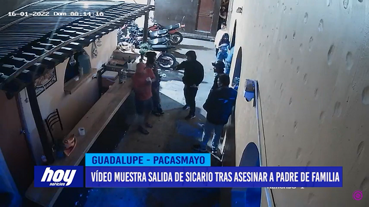 En este otro vídeo se observa al sicario que acabó con la vida del padre de familia Julio Espinoza Sánchez, el último fin de semana en el distrito de Guadalupe, dentro de una discoteca ubicada en pleno centro de la ciudad y a la vista de varios asistentes. Este sujeto con polera y capucha sale a la puerta, ve donde están sus compinches, ingresa y acribilla a Espinoza Sánchez, luego se retira apresurado y sube a la moto para huir con rumbo desconocido.