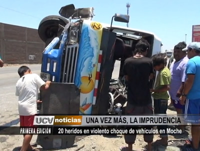 El choque entre una coaster de transporte público de la empresa Salaverry y un taxi dejó como saldo 20 heridos a la altura de la carretera Panamericana en la entrada al distrito de Moche.