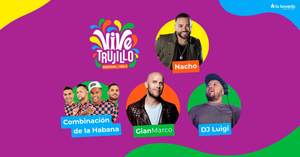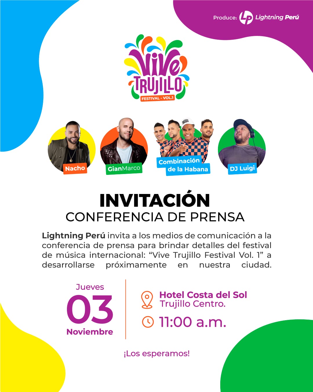 Se invita a los medios de comunicación a la conferencia de prensa sobre el “Vive Trujillo Festival”, en donde se abordarán todos los detalles de este importante festival de música a desarrollarse próximamente en nuestra ciudad y que tendrá, entre sus invitados, a Gian Marco, Nacho, Combinación de la Habana y DJ Luigi.